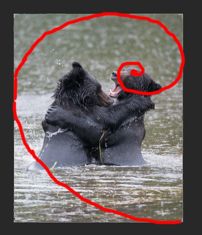 The Crop Tool within Photoshop allows you to apply several different overlays that depict different rules of composition. This screenshot depicts the Golden Spiral. I drew over the overlay in red because it was hard to see from a screenshot.