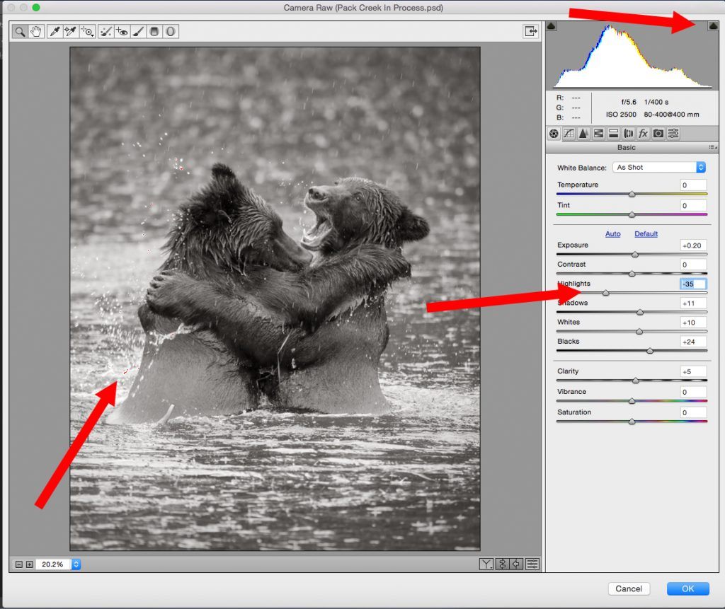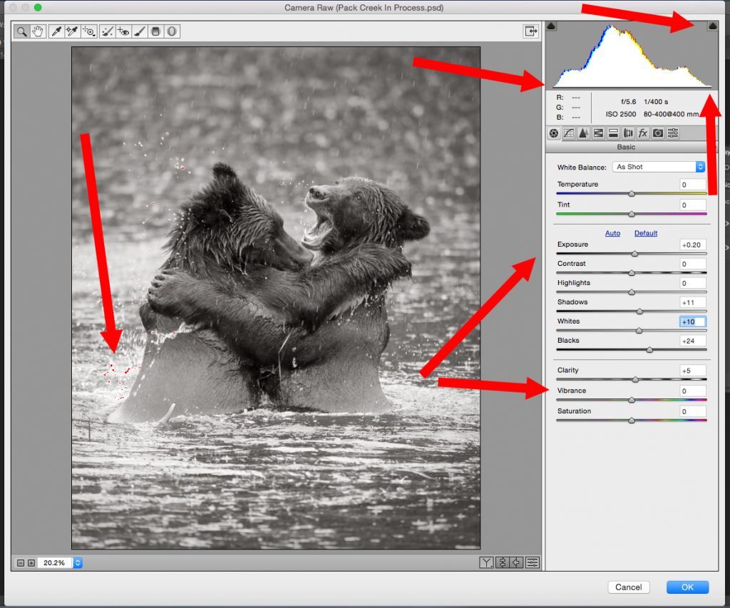 Those little red dots are the warning sign; they indicate clipping is occurring on the highlight end. It’s not so important when the clipping is occurring in a specular white highlight such as splashing water, but we will fix it anyway. Now look to the arrows on the right. I made these global adjustments by observing the image and watching the histogram. They included: Exposure +20, Shadows +11, Whites +10, Blacks +24, and Clarity +5. There is no magic bullet for these adjustments. You simply need to practice.