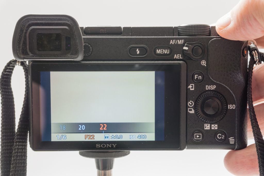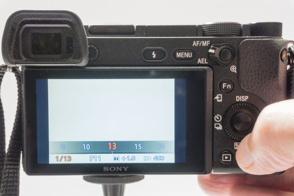 In this picture I am manually adjusting the shutter speed. A quirk of my Sony A6x00s is that, in manual, rotating the control wheel (see my thumb?) changes only the shutter speed. Here it is presently at 1/13 of a second, as you see on the strip and on the left side of the lower band. You can also see that the aperture (f/stop) is currently at f/11. Over on the right you can see the ISO is fixed at 400 because I already set and locked it earlier. Rotating the wheel changes only the shutter speed in this mode; all the other settings are undisturbed.