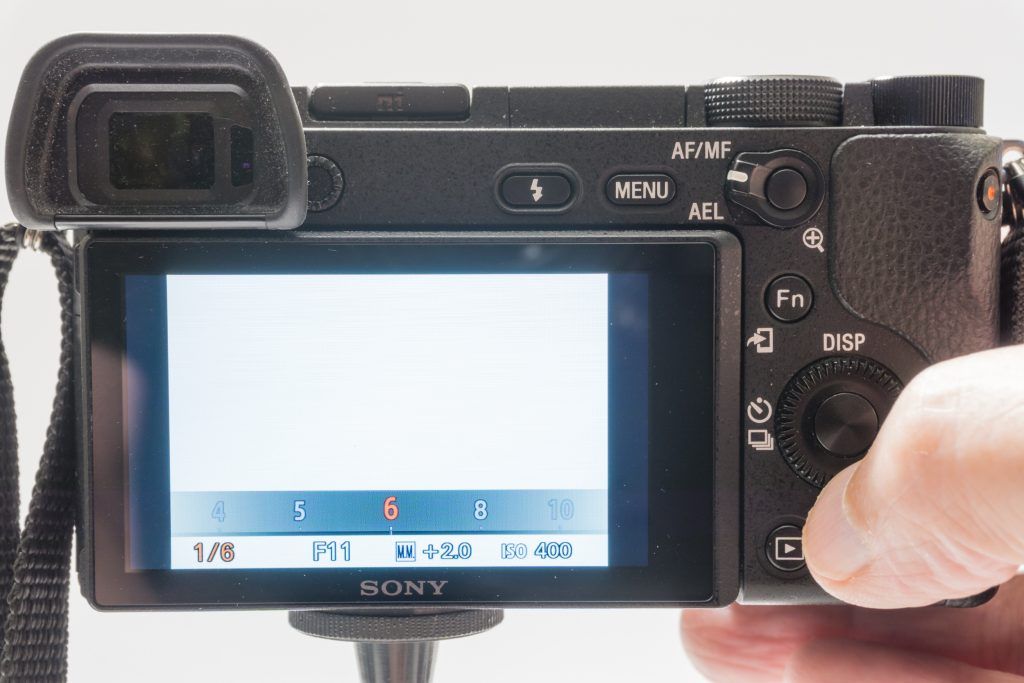 I am changing the shutter from the previous 1/13 of a second to 1/6 of a second (a longer time) by turning the control wheel with my thumb. Coincidentally, that +2.0 you see on the lower band tells me that the camera’s matrix meter senses currently two stops (EV) of overexposure because it’s pointed at a white background.