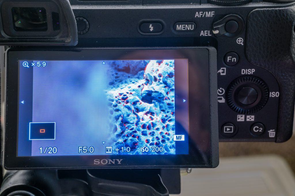 In addition to focus peaking, I have the manual focus magnifier turned on. It defaults to 6X but can be increased. For this exercise I have both the magnifier and peaking turned on. The peaking is especially useful in this case, since I am focusing using the rear screen rather than in the viewfinder. It’s nice insurance that the camera is truly accurately focused.