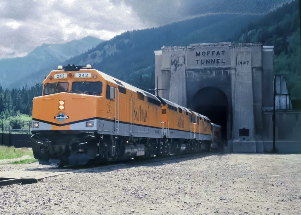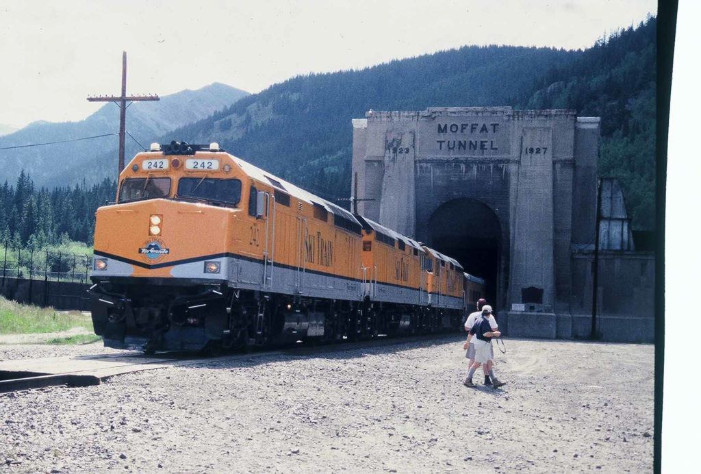 In summer 2006 I had exactly one frame of film left in my camera (oops) and no more in the bag. We waited in the blazing sun outside the East Portal of Colorado’s Moffat Tunnel at 9,200 feet elevation, getting cheerfully sunburned while waiting for a train to pop out. We knew it was in there because the exhaust blowers were deafening. The Moffat is 6.2 miles long with a speed limit of 15 mph; the train needed about half an hour to transit. In the heat it seemed longer.