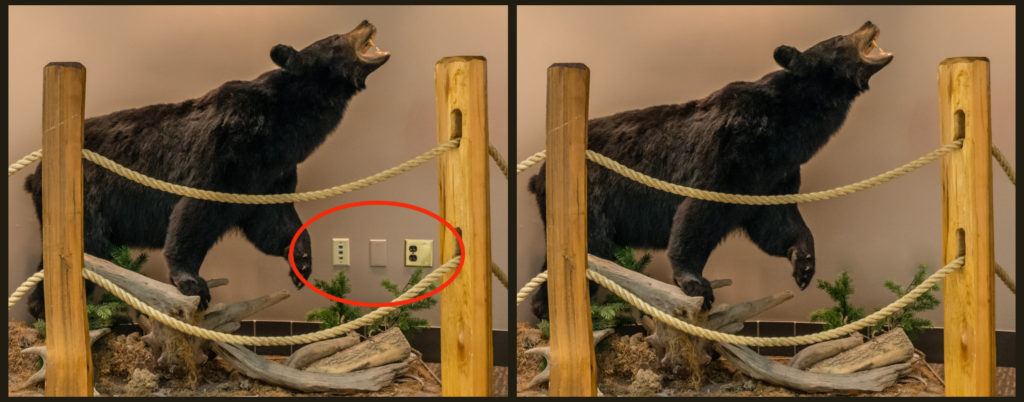 In this instance, the picture of the black bear was marred by inconvenient wall outlets. I used the clone stamp with a small brush feathered about 30%, sourced a spot on the wall directly above each outlet, made sure I had a little room to move my brush up and down without accidentally cloning the outlet itself, and painted over the outlet. By not aligning the source to the brush I could brush my way down, painting perfectly matched plain wall over the outlet below it.