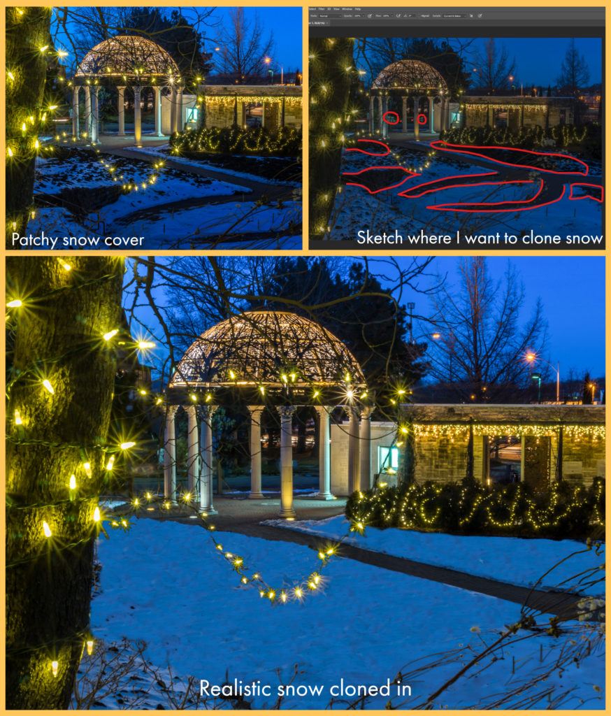 I took this image as an exercise specifically for this article. I was always disappointed in this picture because of the patchy snow, but I knew it would take a lot of very patient cloning since I had to start with very small source areas. As you build up the cloning, though, the areas you can source from get bigger. Don’t forget to move your source around to avoid repetitive pixels—a dead giveaway that cloning has been done. Aligning the brushes also helps to avoid repetition.