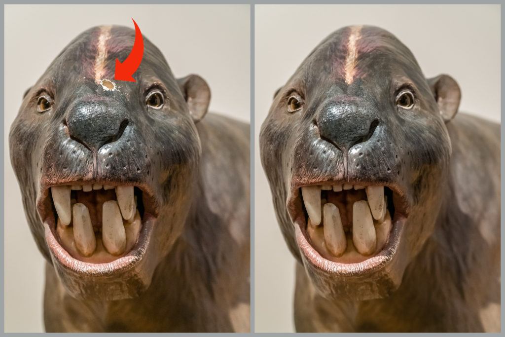 Duplicate your background layer: Command-/ Control+J (just in case). In my files I found this image (above) of a cheerfully smiling sweetie-pie, Stylinodon mirus, that lived some 45 million years ago during the middle Eocene in North America. Most likely, it fed on tough roots and tubers. Somebody maybe gave this grinning model a warning whack on the schnozz, so I decided to see if I could fix the damage with my good old clone stamp tool.