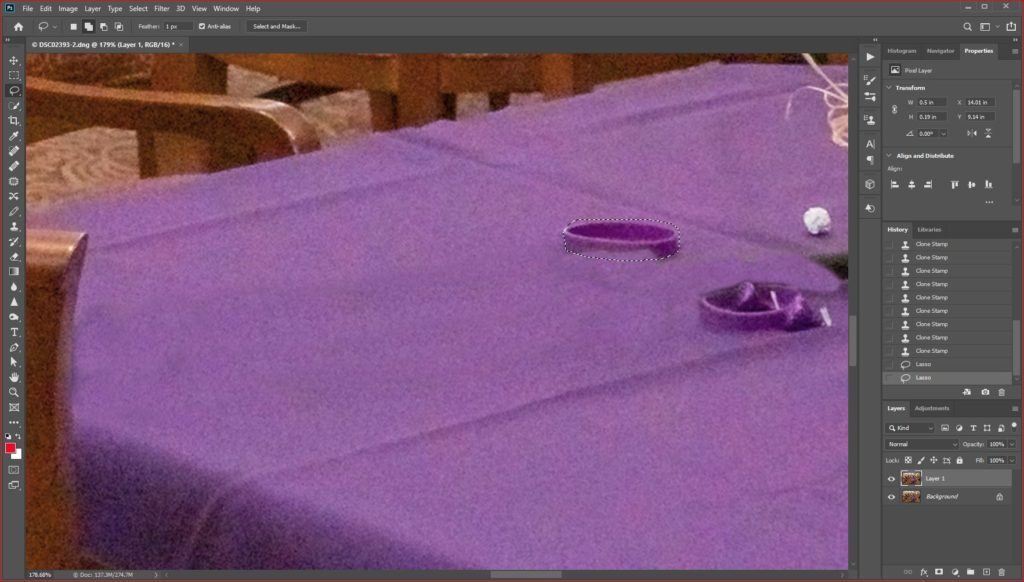 This magnified screenshot was made when I was about halfway through the edits. You can still see some slight shadowing where the monopod was, but I went back and blended it. Because of ripples and shadows, I had to constantly resample to blend the tablecloth believably. Where there was a fold, I kept my eye on the crosshairs at the source instead of where I was painting so I could carefully steer the cloning realistically along the length of the fold. If something didn’t look right, I deleted it and went again. I will not try to kid you: this can be very tedious. You need lots of patience to develop the skill, and Control-/ Command+Z (undo) is your best friend.