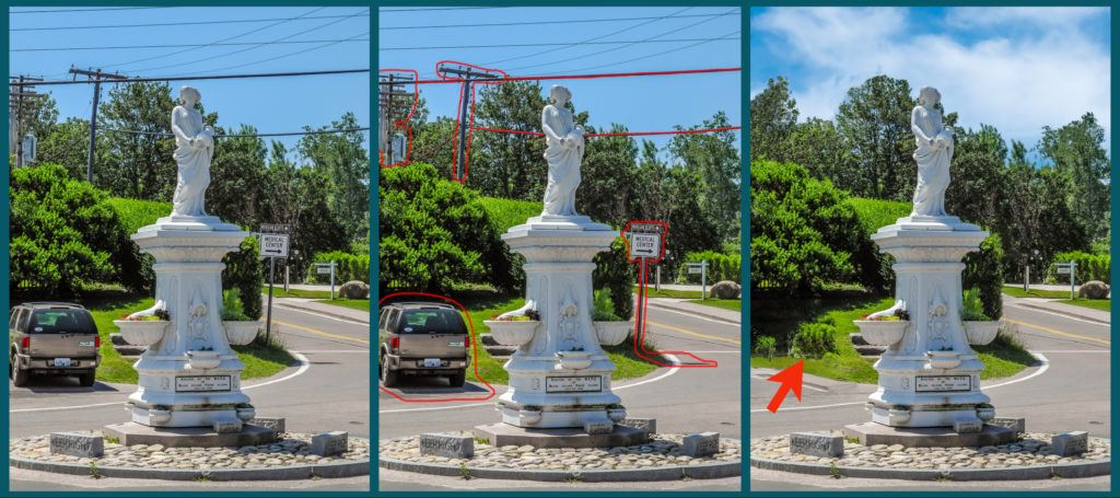 Removing the car and the sign (and their shadows) was done with a combination of content-aware fill and cloning, with even some healing. Things got more complicated with the trees and skyline; nothing but the clone stamp and/or the healing brush in replace mode would work. The bush on the lawn on the left has had its obvious cloning repaired. I always save all the layers so I can go back and easily remedy my mistakes. I only recently learned that I could do all my retouching on blank layers.