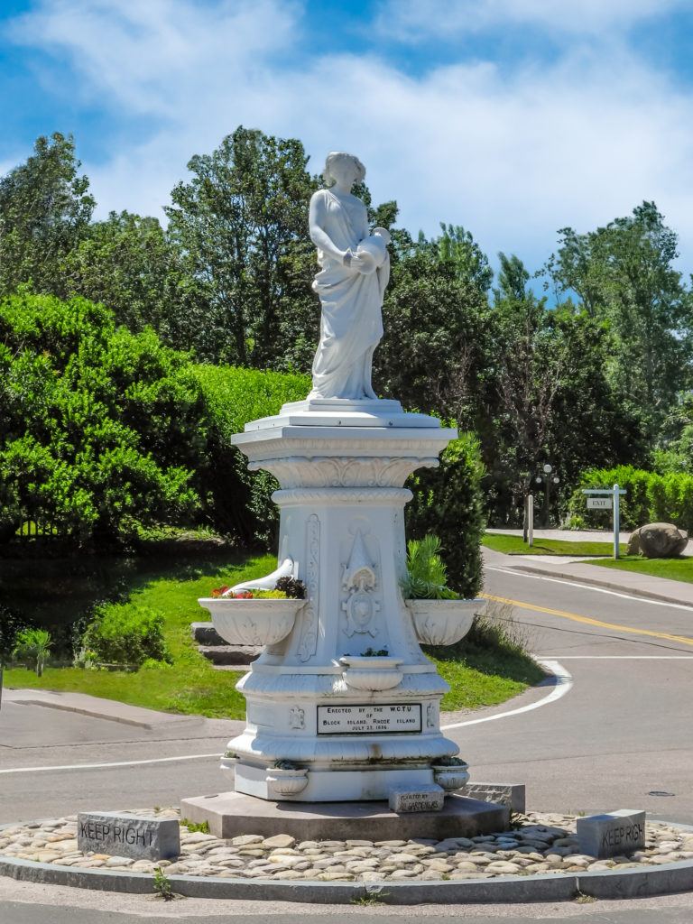 “Named for the biblical Rebekahat-the-well, Block Island’s ‘Rebecca’ stands proudly at the intersection of four Old Harbor roads. This iconic Block Island lady was put in place in 1896 by the local Women’s Christian Temperance Movement, which hoped to curb the consumption of alcohol on Block Island. Temperance fountains were installed in hundreds of communities; the idea was to offer clean water as a healthier option than the ubiquitous refresher of the time, beer. Restoration experts have concluded that Rebecca is in fact Hebe, cupbearer to the Gods at Mt. Olympus, also goddess of youth and wife of Hercules. Hebe was said to have diluted the wine she served with water. The statue was recast in 2001 and still succeeds in reminding the public to be mindful of what we drink.”