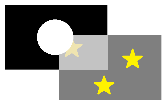 This simple graphic illustrates how white wins when combining two images. The white circle has “used up” that part of the canvas so that the stars in the second image won’t show up if they are positioned in that spot. The stars will show up on the parts that are black, because they haven’t been exposed yet.