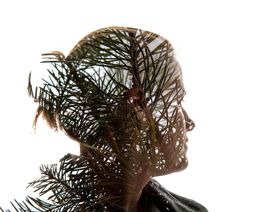 This image was taken using the second technique I described. The first image was shot against a window from a slightly lower vantage point, to almost blow out the background sky. The second image, of some pine boughs, was also shot against a white background, paying careful attention to include any white spots near the back of the model’s head, so that the facial features were still distinct while the back of the hair and shoulder disappear in the pine needles. Photograph by Leanne Cleaveley