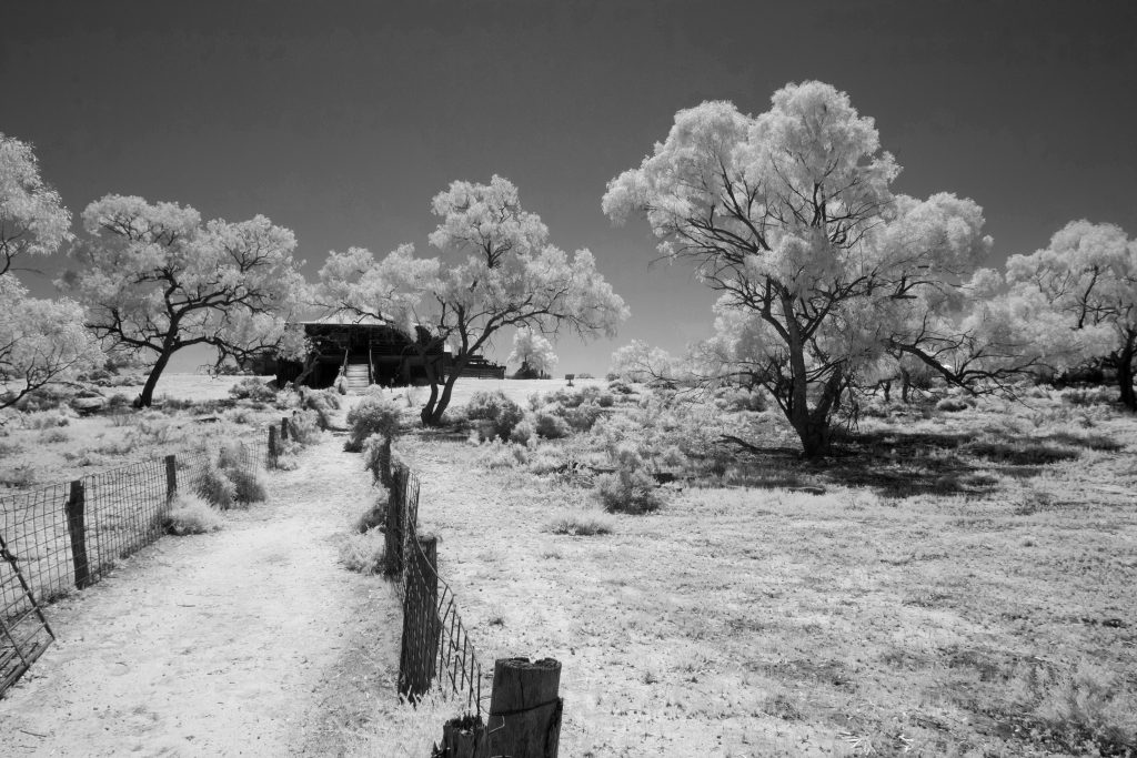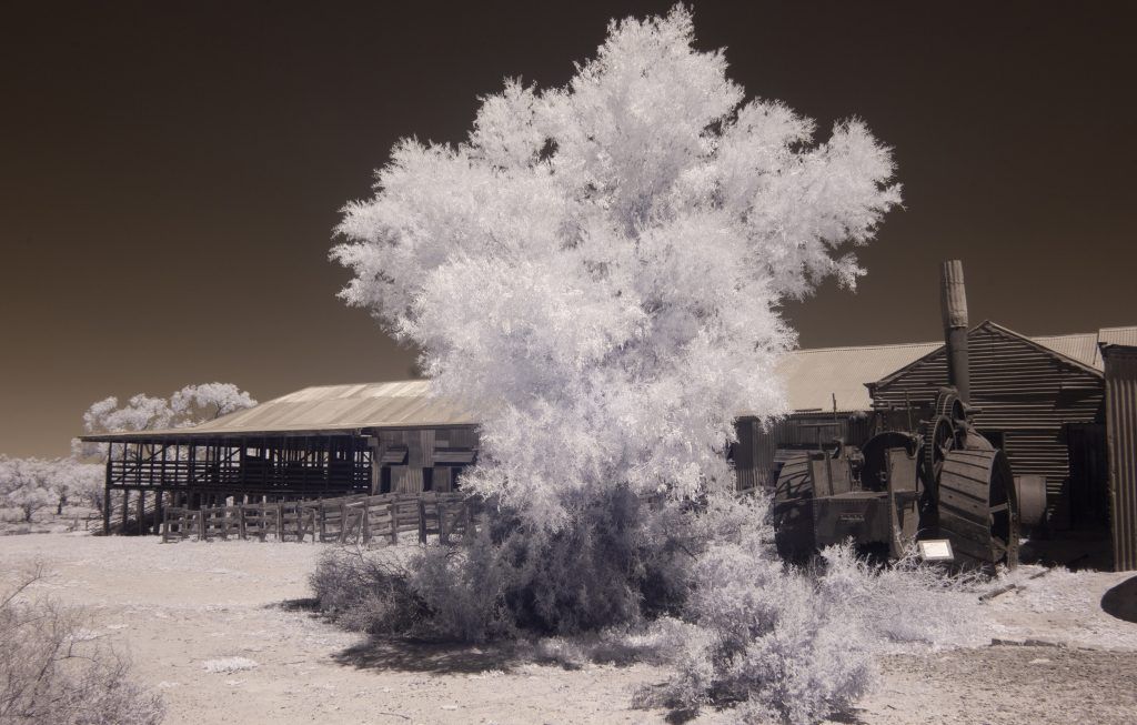 Kinchega shearing sheds, Western NSW, Australia. This shot has had very little post-production other than a bit of global darkening. Normally I’d convert the RAW file to black and white and then add some contrast, but in this instance I quite liked the sepia look produced by the infrared filter. Photograph by Robin Nichols