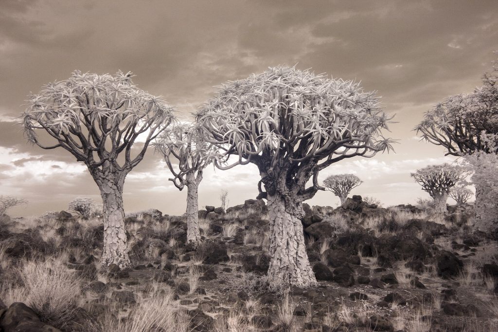 One of my all-time favorite landscape locations in Africa, Keetmanskoop in Namibia. At the time a storm was approaching, which made the sky very dark and moody among the forest of quiver or kokerboom trees. Photograph by Robin Nichols