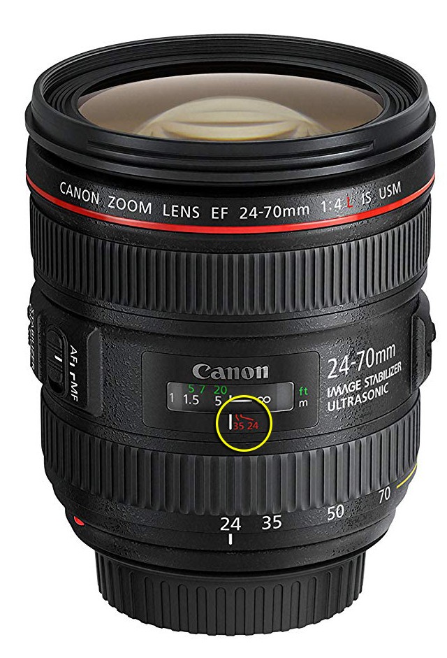 - Use the lens’ infrared focusing mark, if the lens has one (see picture of Canon 24-70mm f4 lens. The infrared focus point is ringed in yellow).