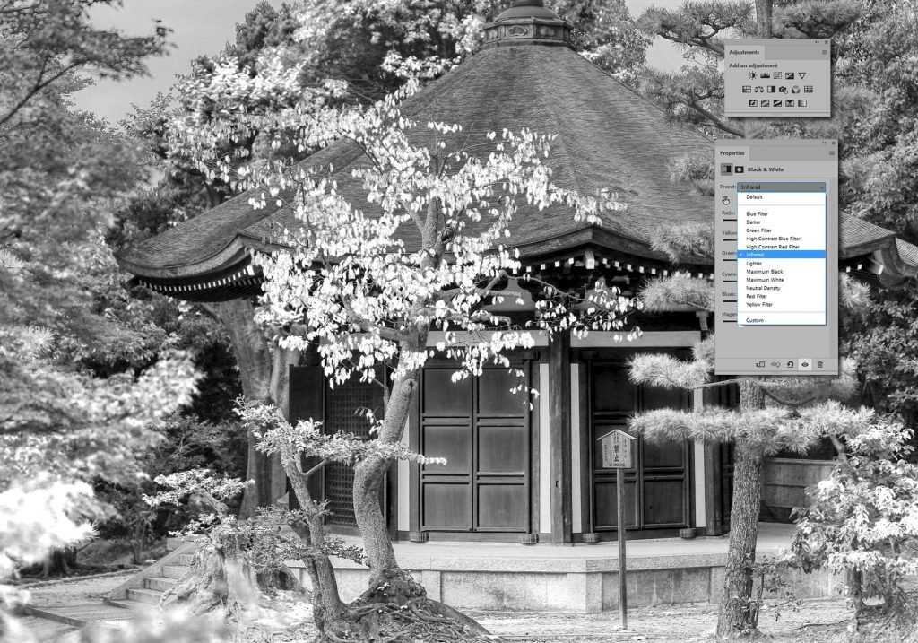 Using this not only converts a color image to black and white, but one of the dropdown menus is specifically for an ‘Infrared’ effect. This is essentially a preset from the Channel Mixer. If the infrared effect is not strong enough, just tweak the color sliders in Adjustment’s Properties panel for a better effect.