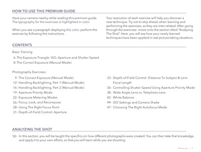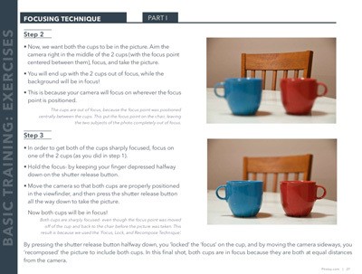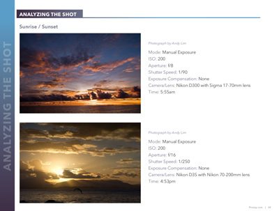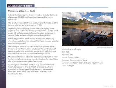 After going through the exercises, move on to the section called “Analyzing The Shot” in order to see how those techniques are applied in real picture-taking situations.
