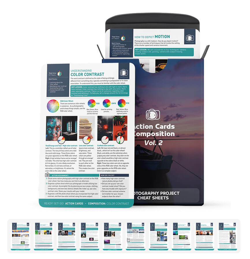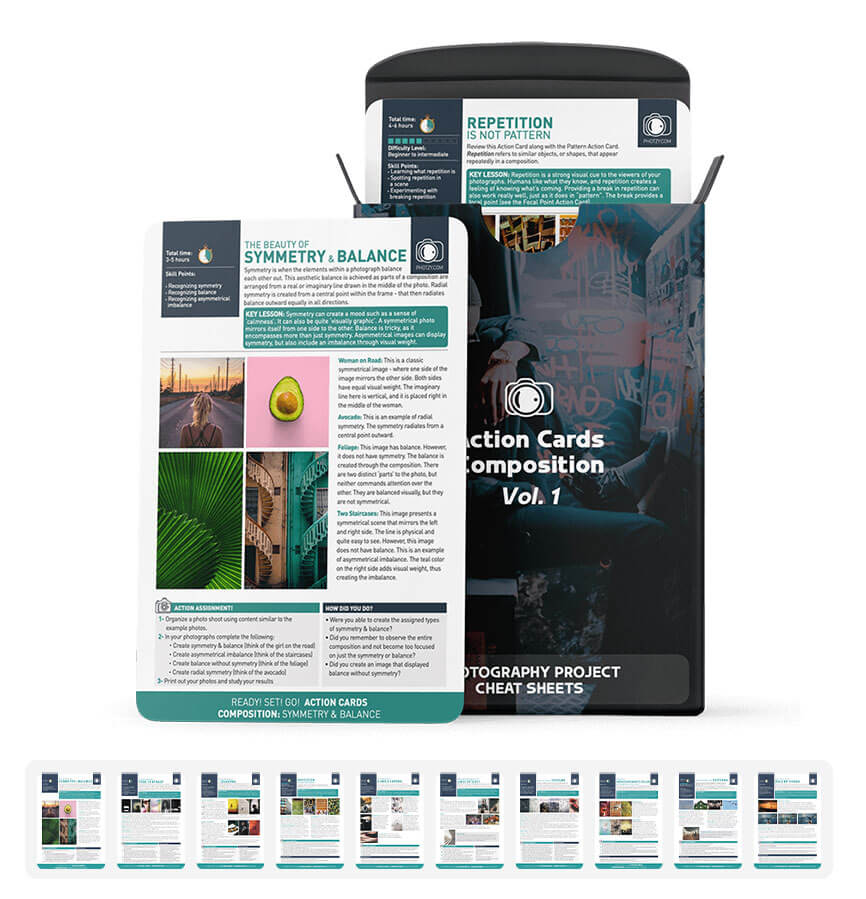 15 printable composition project sheets, with over 49 photography assignments. These will give you a complete understanding of the various rules, tools, and concepts of composition.