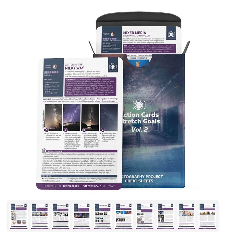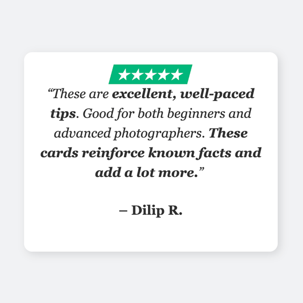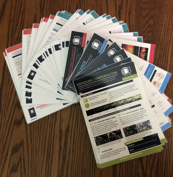 The cards were truly a blessing to me as I could take my time and peruse them at my own pace while I played with the camera as I was reading through them… Your cards covered many “basic” ideas such as how the exposure triangle works together yet you also gently covered intermediate topics and even branched into some advanced topics without leaving me on the fringe, Thank you.”