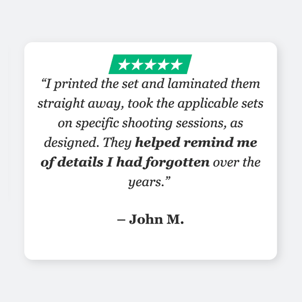 “I printed the set and laminated them straight away, took the applicable sets on specific shooting sessions, as designed. They helped remind me of details I had forgotten over the years.”