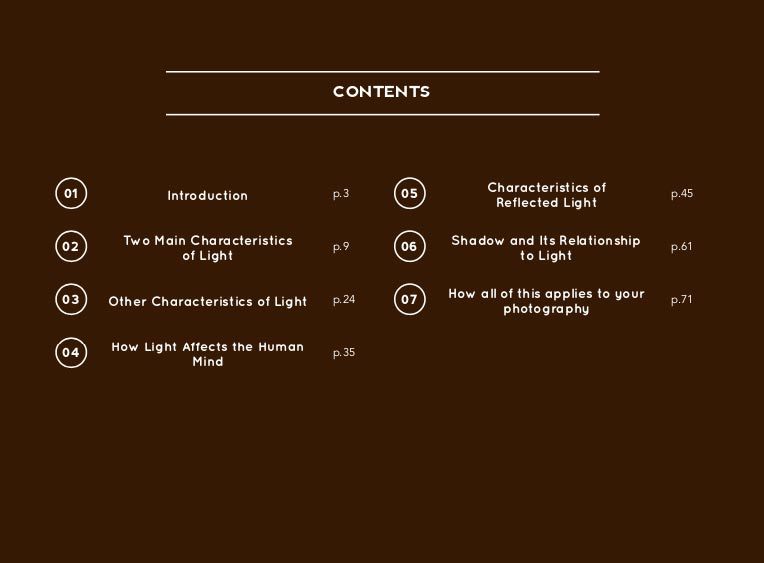 It covers the essential first steps towards your full comprehension on the subject of light, and how to make it work in your photography – the key characteristics of light, bouncing light, balancing camera point-of-view and light source, how to ‘read’ the light in any scene, and much more.