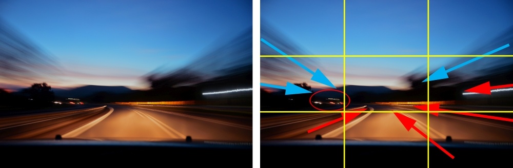 - The blue arrows indicate secondary leading lines. They become secondary leading lines due to motion and contrast. This point is important. A leading line isn’t necessarily “always” a physical line- just as the “sight line” in example 3 wasn’t a physical line. Try to think of leading lines more as a stream. The water flows, and the ebbs and tides of rocks (or whatever) push the water this way- and that way- sometimes hard and sometimes gentle. Your use of leading lines should help push a viewer’s eyes through your photograph- sometimes hard and sometimes gentle. The converging lines on the road (in example 4) are a hard push. The soft contrasting clouds in the sky are a soft push.