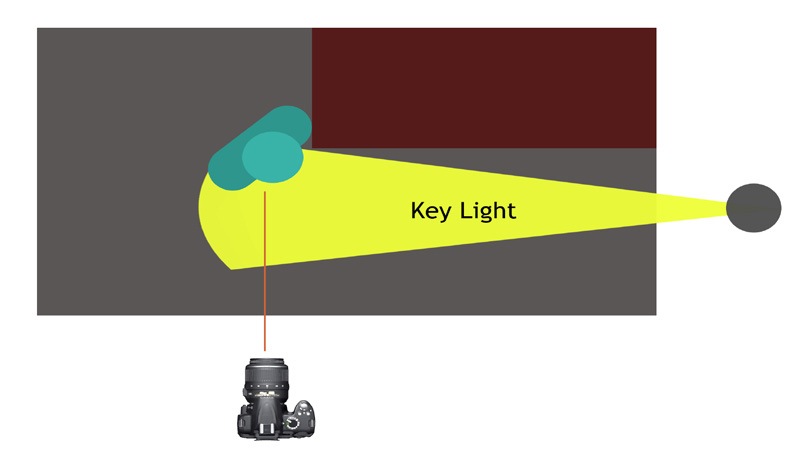 The key light is your principal or main light source. In most cases, the key light is the strongest and brightest light source. It is the one that illuminates the subject. If you have only one light source to light up your subject, that is your key light. This light point source is the basis of all your other point sources. If we’re shooting an object or a person, we almost always want the front to be illuminated. That is why most of the time the main light source is located in front of your subject, more specifically on the front side around 45 degrees or so. However, this is not always the case. With more knowledge of lighting, you may effectively use key light from any direction you prefer. Take a look at the diagram below. This uses a basic studio lighting setup for key light. It’s a one light setup with no other light source.