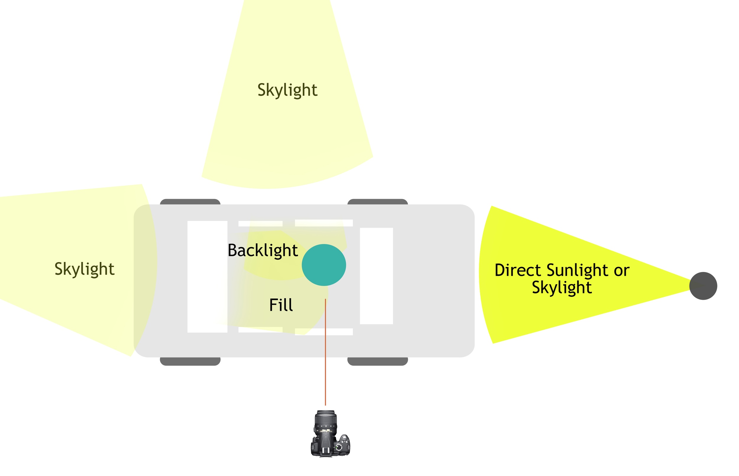 In the example photo, the subject is in the driver’s seat. Light from the windshield serves as key light based on the amount of light hitting the subject from that side. Hair light is also seen coming from the driver-side window. There is also light hitting the subject’s back, possibly coming from the rear car window. The left side of the woman’s face has a bit of fill.