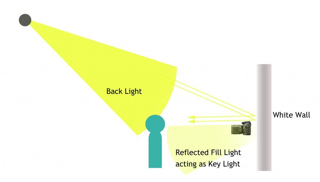If light from behind the subject is strong enough, you can use a reflective light source to bounce back that same back light to illuminate the front side of the subject. With the absence of a proper key light, fill light again acts as key light in this scenario.