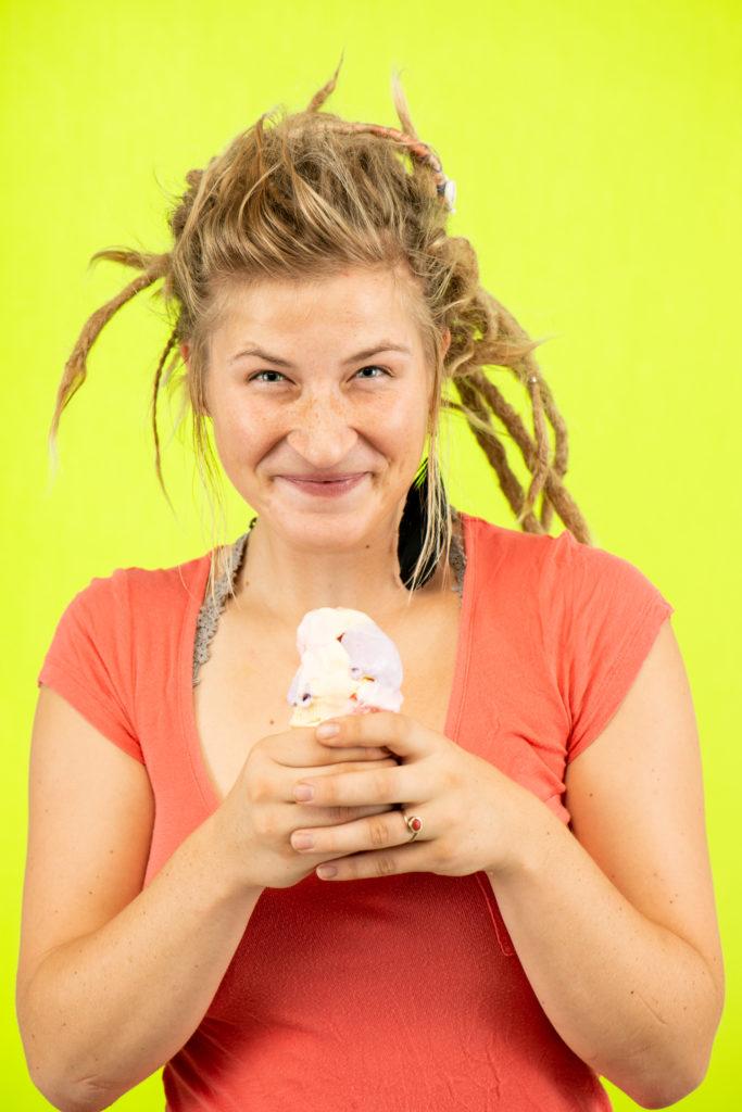 A friend wanted me to photograph her with ice cream. She loves ice cream. So, I suggested we create two different styles of image: one with a typical, happy, summery feeling, and the other darker and somewhat sinister. The main aspects of creating the two styles came down to her expression and the tone of the images.