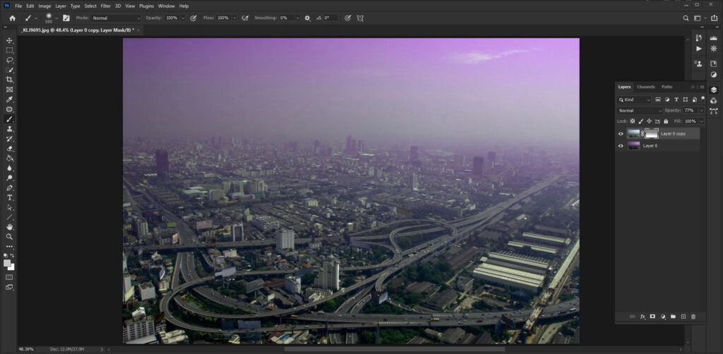 In this example, I’ve duplicated the same image and placed them on separate layers. I edited the sky in the lower layer to change the color. On the top layer, I added a layer mask and then used a brush to erase the upper portion of the image to reveal the colored sky of the lower layer.