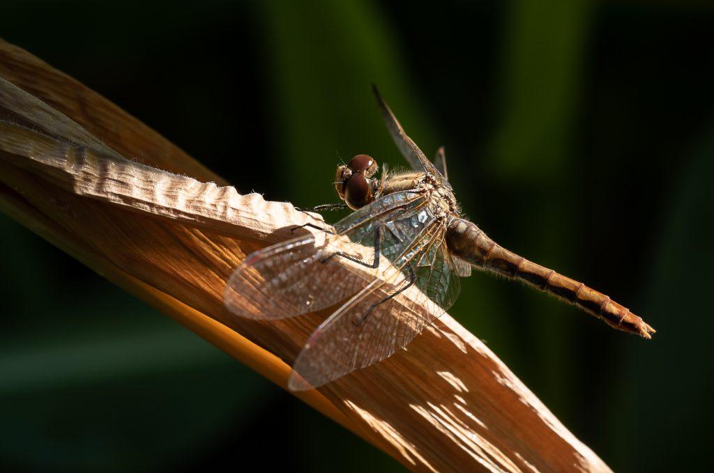 Nothing beats the warm light of the sun for lighting macro images. The sun was bright and almost overhead when I shot this, creating some dramatic spots of light and shade. Thankfully, the dragonfly perched in just the right spot to capture that light. Photo by Leanne Cleaveley