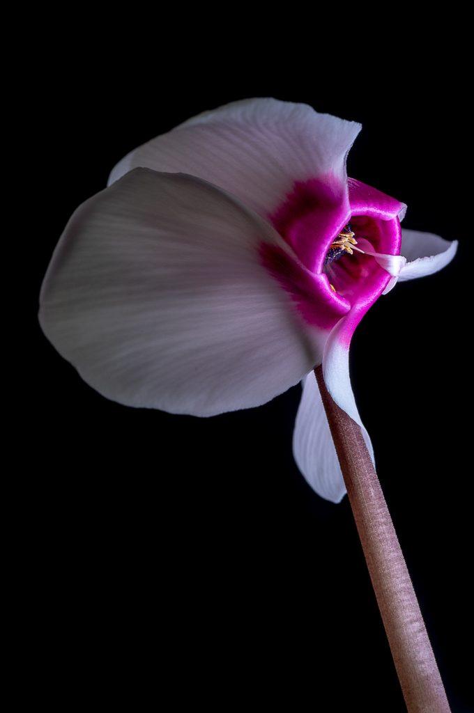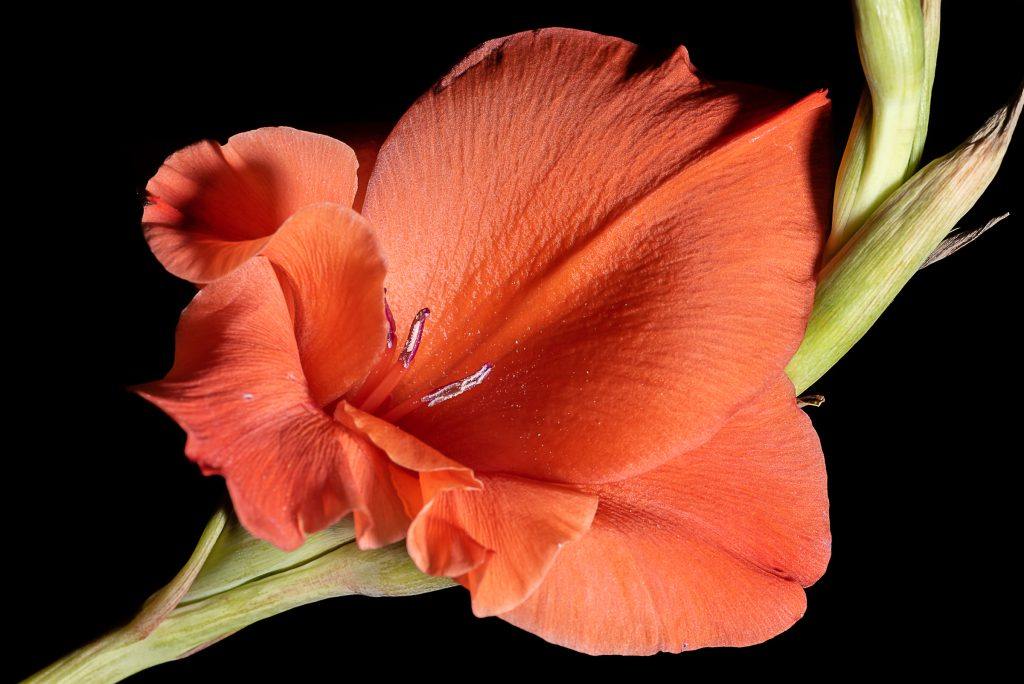 Shot at f22 and ISO 125, I was able to achieve a nice black background for this image of a gladiolus, with room lights on. The key was to not have any objects close enough in the background that might be exposed by the flash. The flash was powerful enough to make the ambient room light redundant. Photo by Leanne Cleaveley