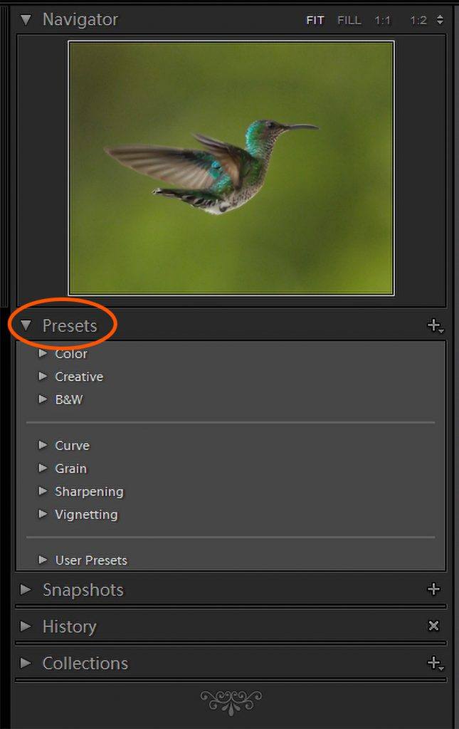 The Presets panel is found on the left side of the Develop Module, below the Navigator. The Presets panel holds folders where the Presets are saved. LR comes with some Presets already included for you to try.