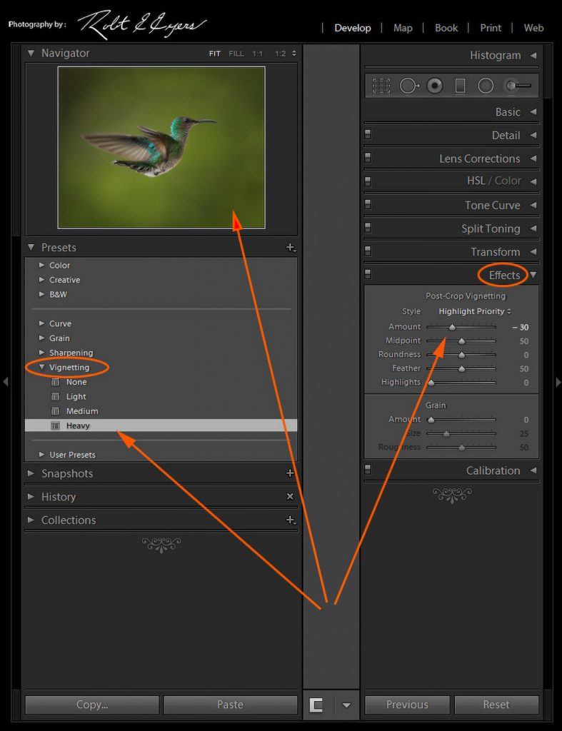 Anything that can be done in the adjustment panels of the Develop Module can be saved as a Preset. In the image above, a heavy vignette has been applied to the selected image, which is previewed in the Navigator. This is a very simple use of a Preset, but it demonstrates that a single click of a Preset can apply a previously saved adjustment of a specific value.
