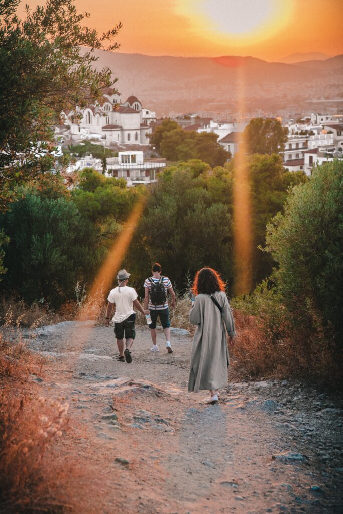 The path and people walking establish foreground interest that adds depth and perspective. Photograph by Peter Chirkov