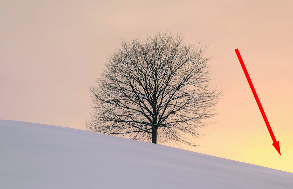 A horizontal orientation disrupts the balance and flow, creating an eye snag (a distracting element) away from the subject area (the tree) in the lower-right corner. Photograph by Fabrice Villard and Cropping by Kent DuFault