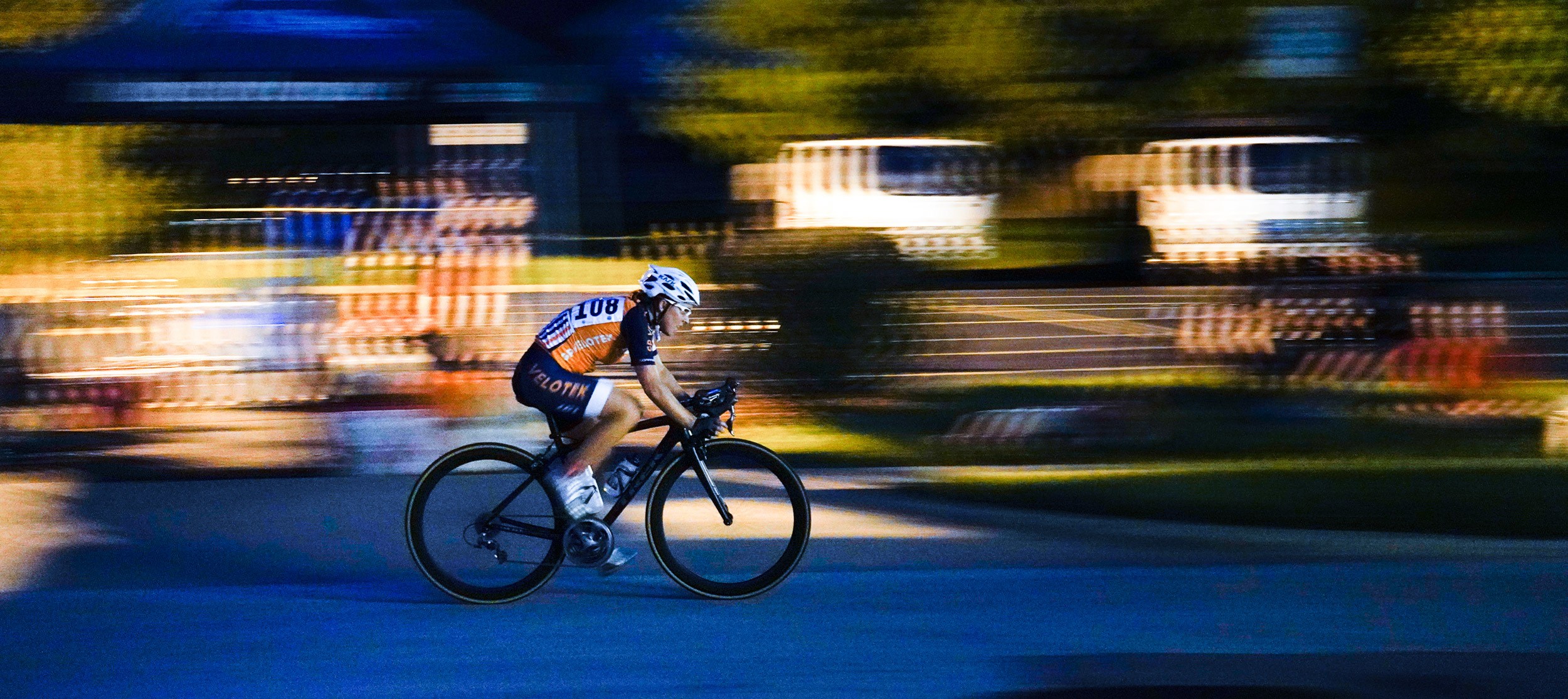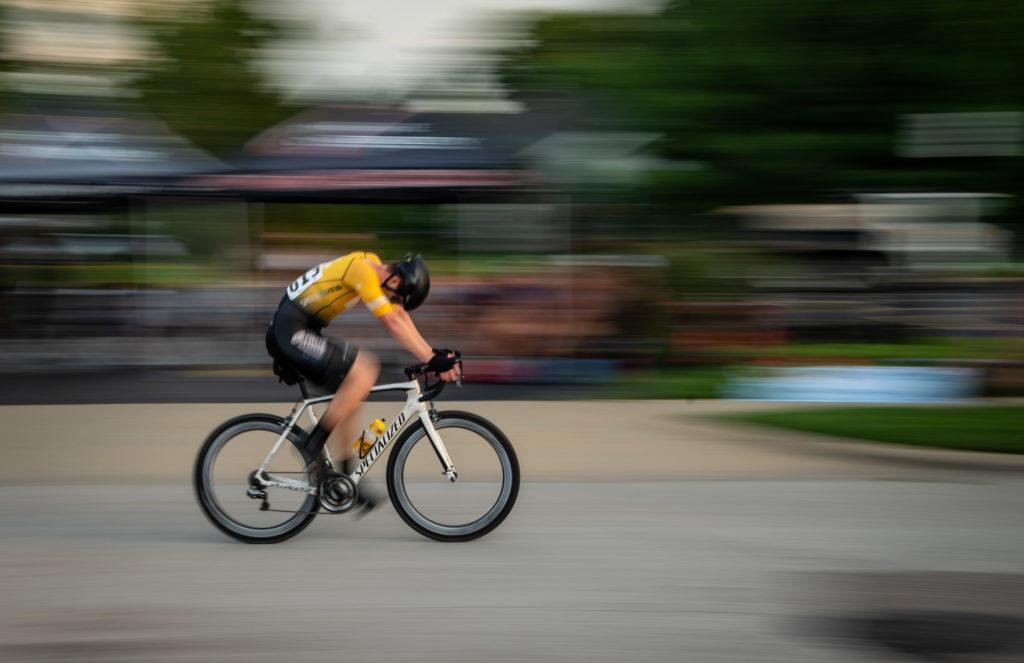 Panning a bicycle racer. The racer is in focus, and the background appears to be in motion. My settings were f4.5 @ 1/25th of a second, ISO 4000. Photograph by Jenn Mishra