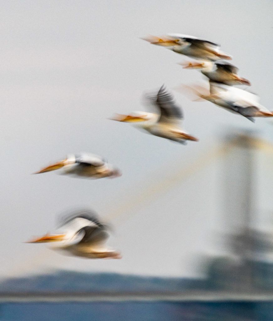 Motion blur created by subjects in motion. In this case, a flock of pelicans moves across the frame when my shutter is open. My settings were f8.0 @ 1/10th of a second, ISO 800. Photograph by Jenn Mishra