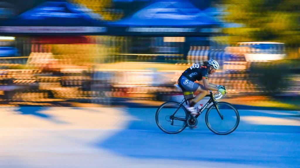 At this local bike race, cyclists went around the same track dozens of times. Each lap gave me opportunities to practice panning. My settings were f4.5 @ 1/25th of a second, ISO 5000. Photograph by Jenn Mishra