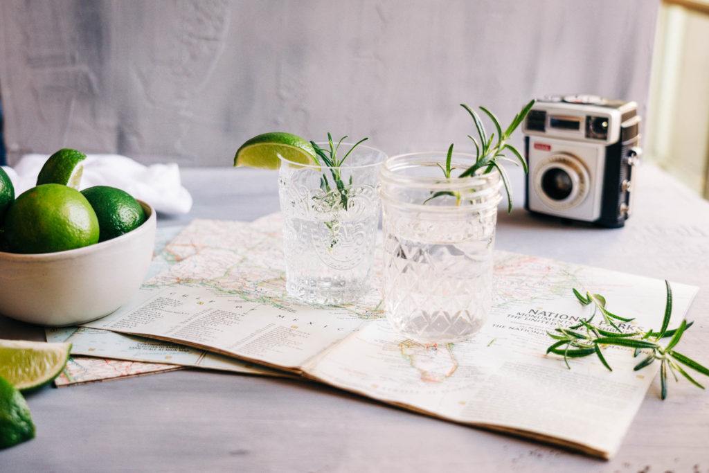 A simple cocktail one evening spurred an exercise in creativity with vintage maps, vintage cameras, and a splash of lime to add some color. A simple white sheet added a backdrop and soft window light accentuated this scene. Photograph by Karthika Gupta