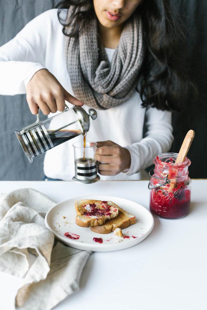 Morning coffee and homemade jam were key for this breakfast scene. And yes, I do use my French press every day for that morning cup of joe. Setting this scene was as much fun as enjoying the breakfast a few minutes later. Photograph by Karthika Gupta