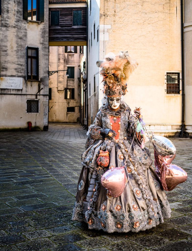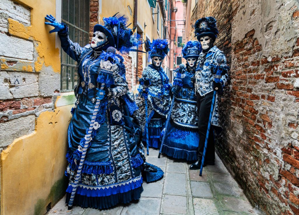 Shooting in narrow Venetian streets can be challenging. I used a focal length of 24mm to photograph this masked ensemble. Photograph by Jenn Mishra
