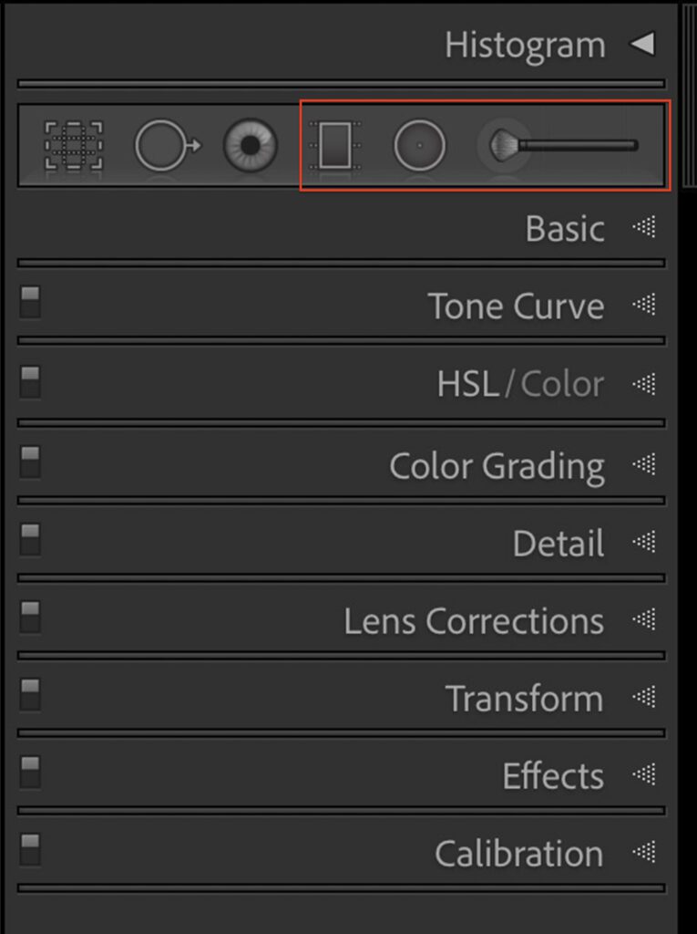Screenshot of Develop module in Lightroom Classic showing local adjustment filters. From left to right: Graduated Filter, Radial Filter, and Adjustment Brush tool. Photograph by Jenn Mishra