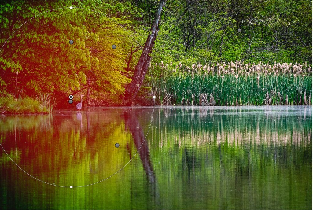Let me give you an example. In this image, I drew a Radial Filter around a Great Blue Heron to lighten the shadows and increase the clarity. This helps visually separate the bird from the shaded background. The red shading around the bird is the filter’s mask. This shows you where the edits are applied. The mask becomes lighter as the effect fades out. Toggle the “O” key on your keyboard to see the mask or hide it.