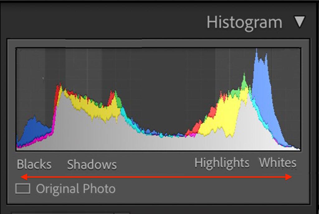 Screenshot showing range of exposure values on a histogram. Screenshot by Jenn Mishra
