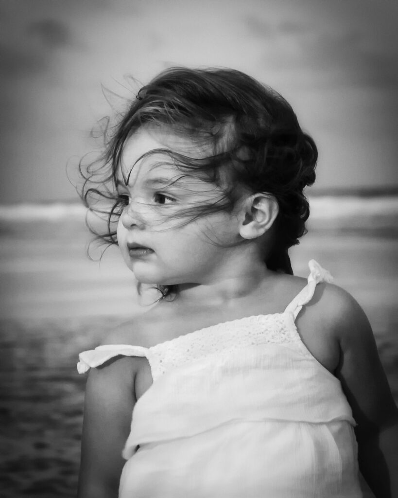 The image above becomes special, mainly due to the contrast and texture of the girl’s blowing hair. I also used the difference of the white top against the dull gray background to add story and shape to the subject.
