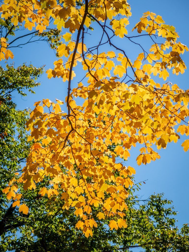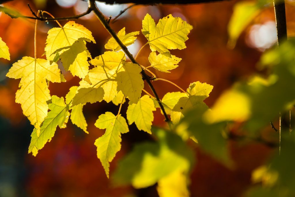 Backlit golden autumn leaves pop against a background of darker red. Photo by Charles Haacker