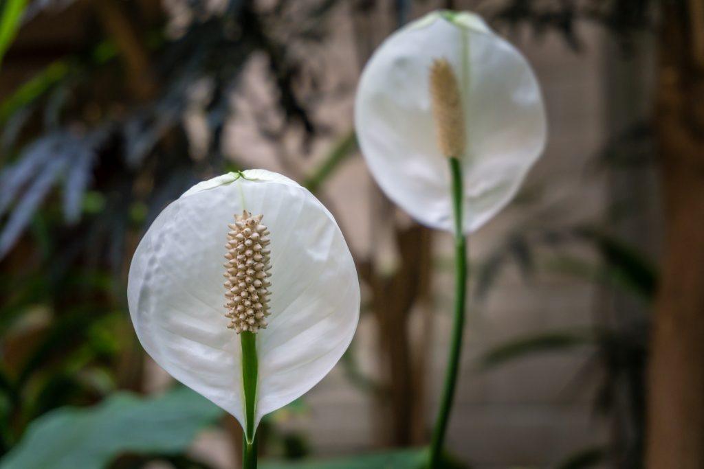 Only a skylight in a greenhouse lit these globular Peace Lilies. This lighting is quite flat and not very flattering to these beautiful flowers. Backlight would have helped immensely! Photo by Charles Haacker