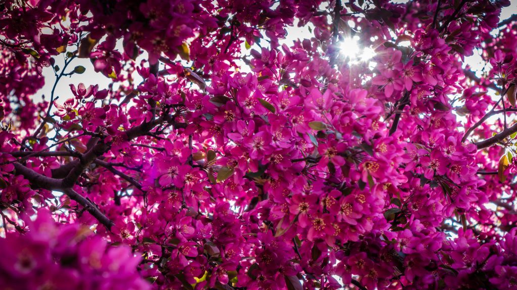 This photo was taken in early spring, getting right up underneath a flowering tree with the sun in the picture blazing through a gap in the blossoms.