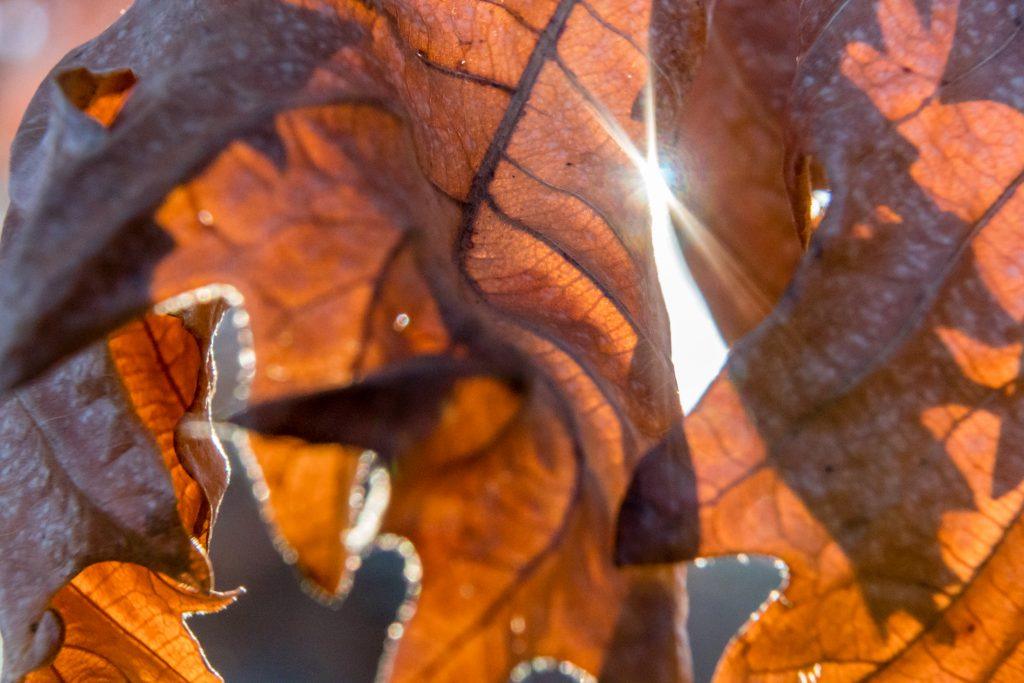 This photo was taken in very late fall, in very late afternoon light, of desiccated oak leaves with the sunburst peeking through a gap. This is another example of the previous Key Lesson. In this case I used a short extension ring to get in very close. Take notice of how the use of backlight adds color, shadow, shape, and texture, while also providing a dramatic focal point.
