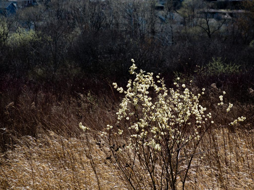 The sun was rising just out of frame, above the trees, to illuminate this plant. The sun above and behind the trees lets them go black so as not to distract from the fuzzy, tiny pussy willow blossoms.
